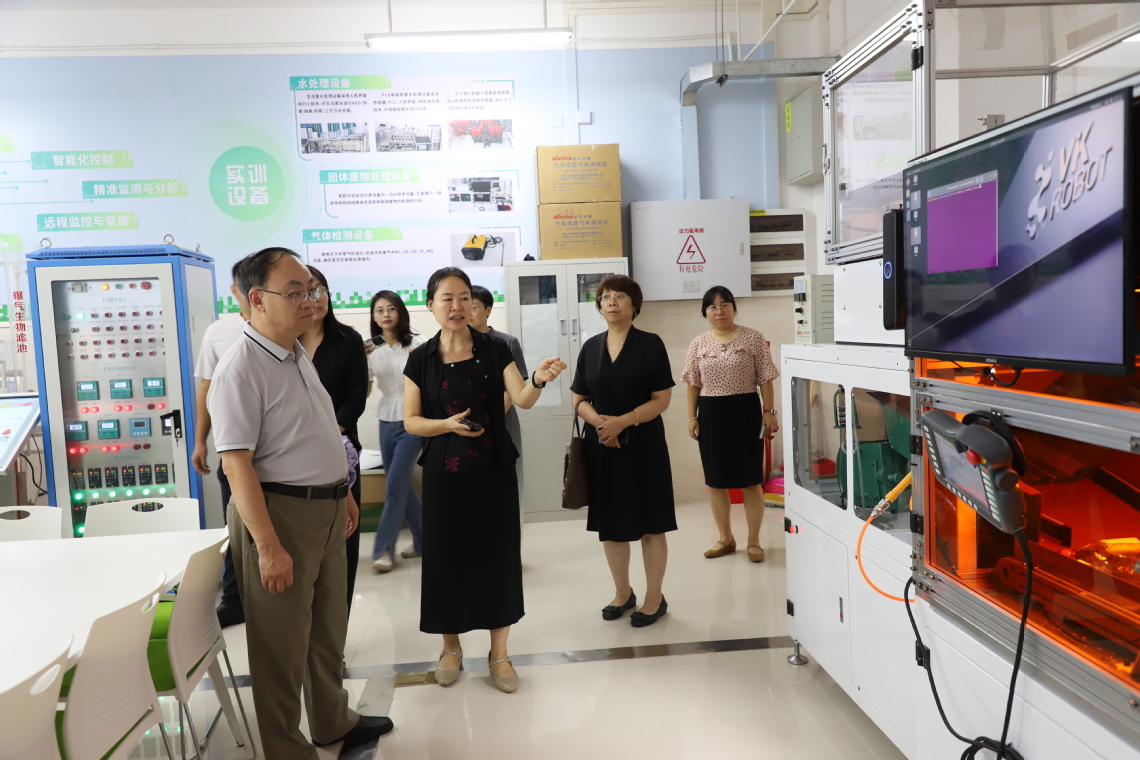 在广东环境保护工程职业学院,调研组一行受到了该校党委副书记、校长孙水裕,党委委员、副校长兰青的热情接待。座谈会上,孙水裕介绍了广东环境保护工程职业学院在打造高水平专业群、构建“以群建院”管理体制、开展对外技术服务以及牵头制定国家教学标准等方面的特色成果与经验。兰青分享了学校在全国率先开设智能环保装备、环境大数据等新兴专业的探索历程,以及在深化氢能产业校地合作、建设产业学院实训基地等方面的实践举措。韩承辉对广东环境保护工程职业学院的热情接待表示感谢,并介绍了我校的基本情况。他表示,希望两校未来能在标准共建、资源共享、竞赛共育、师资互派等方面建立常态化合作机制,携手培养服务国家“双碳”战略的高素质技术技能人才。调研组实地考察了智能环保装备实训室、水环境智能监测教学做一体化实训室、VR虚拟仿真实训中心及污水处理仿真工厂等实训场所,并就虚拟仿真项目开发、实训基地安全管理等具体问题与现场技术人员进行了交流探讨。